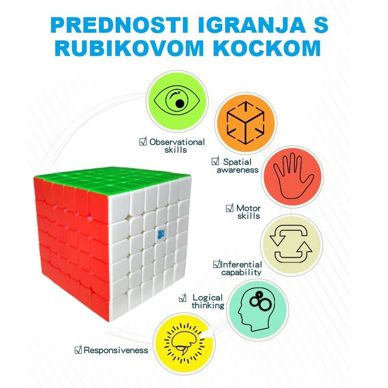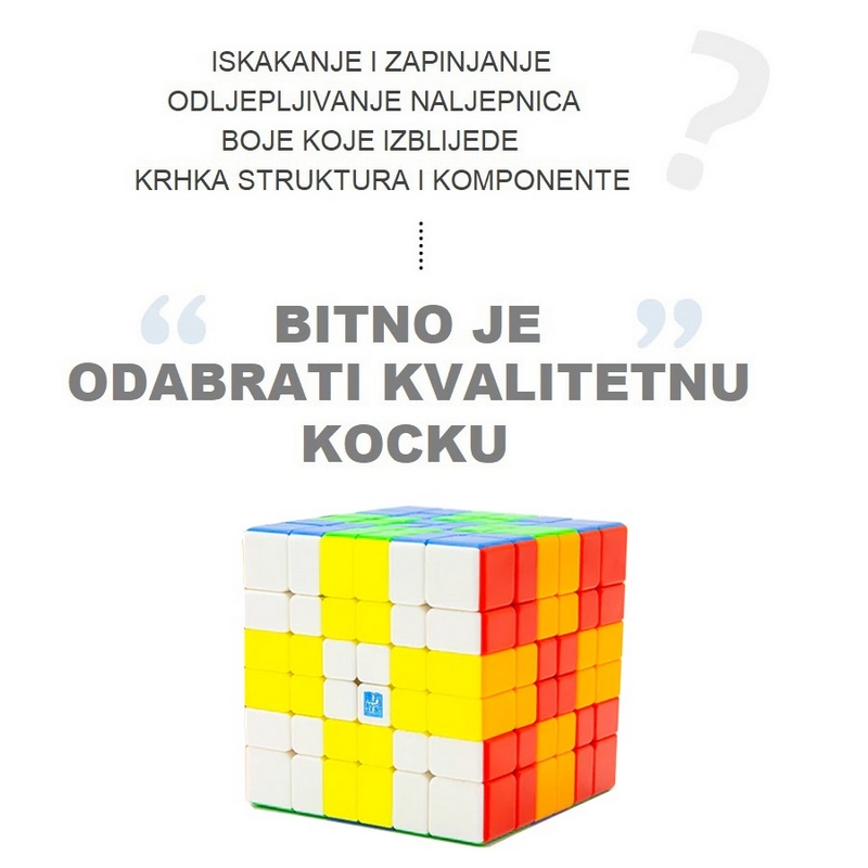 Premium kvalitete, sa posebnim ćelijama koje sprječavaju zapinjanje i štopanje. Jako brzo i jednostavno se okreće zahvaljujući magnetima poredanim između stjenki rubova. Pločice nemaju naljepnice i nije moguće varati. U paketu dođu i mini upute kako složiti kocku.