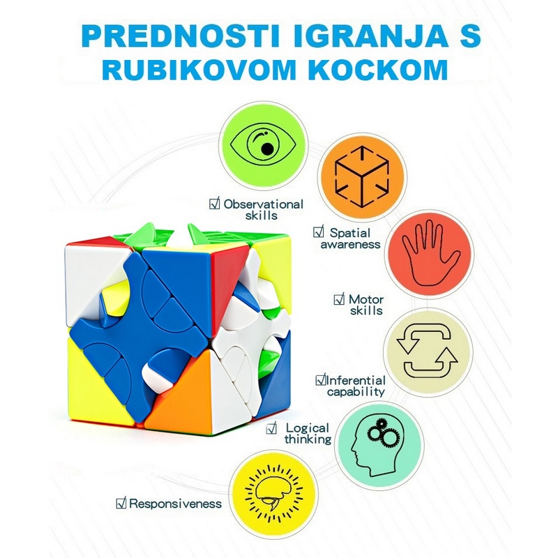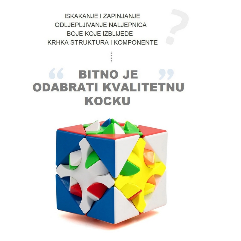 Opremljena je novim mehanizmom koji se brže i lakše okreće. Premium kvalitete, nema zapinjanja i štopanja. Jako brzo i jednostavno se okreće. Specijalne površine za bolju kontrolu i prihvat, vrlo kvalitetna i okretljiva. Pločice nemaju naljepnice i nije moguće varati. U paketu dođu i mini upute kako složiti kocku.