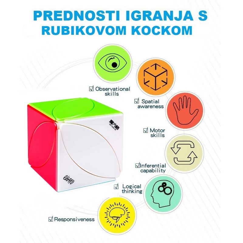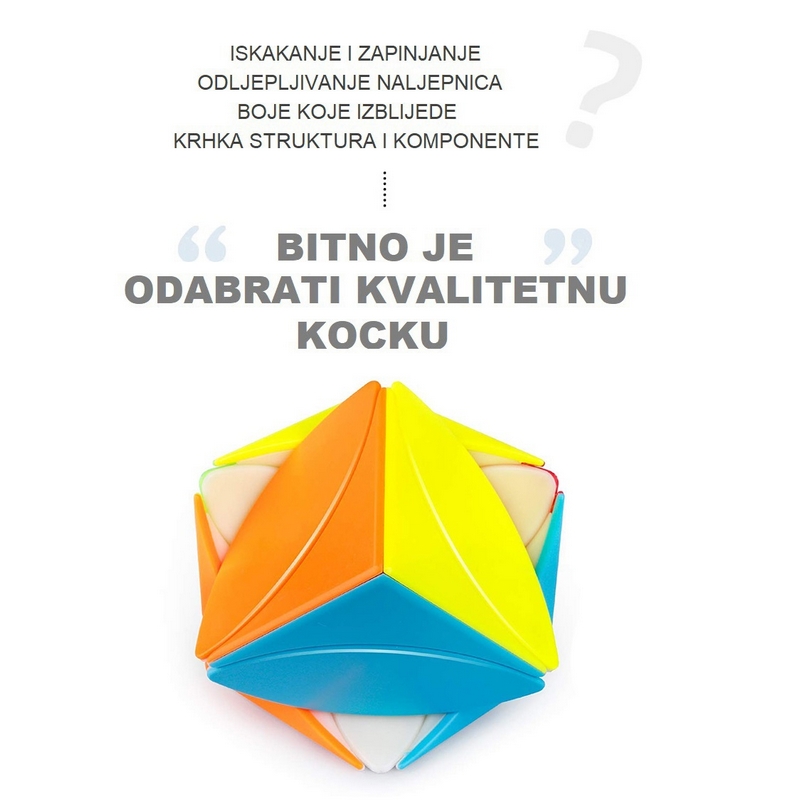 Jednostavnija slagalica od klasične 3×3 kocke, idealna za početnike. Okreće se u stilu Skewb kocke. Premium kvalitete, nema zapinjanja i štopanja. Jako brzo i jednostavno se okreće. Pločice nemaju naljepnice i nije moguće varati. U paketu dođu i mini upute kako složiti kocku.