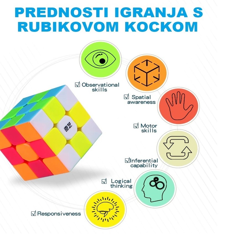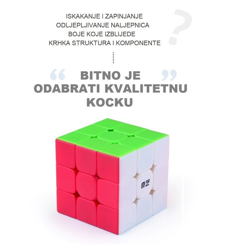 Specijalna super brza kocka, opremljena je novim mehanizmom koji se brže i lakše okreće. Premium kvalitete, nema zapinjanja i štopanja. Jako brzo i jednostavno se okreće. Pločice nemaju naljepnice i nije moguće varati. U paketu dođu i mini upute kako složiti kocku.